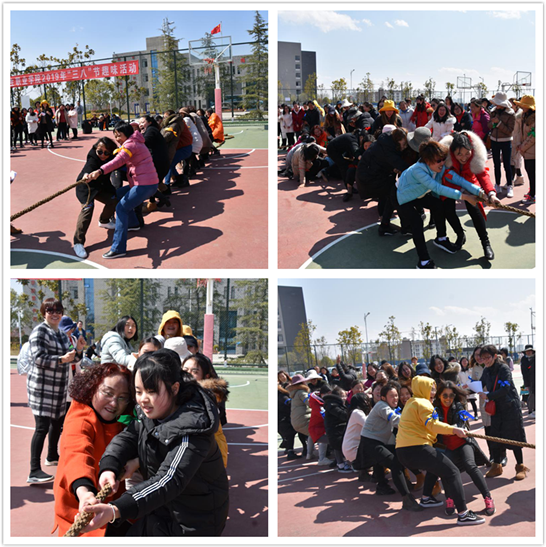 活动中,169余名女教职工分成红、黄、绿、蓝四个小组,进行了拔河、球拍运球+垫子接力、抱抱团游戏三个项目的比赛。拔河比赛紧张激烈、振奋人心,在大家的呐喊助威声中,比赛双方倾尽全力与对手顽强拼搏,比赛双方敢于拼搏、不言放弃的精神感染着在场的每一个人。
