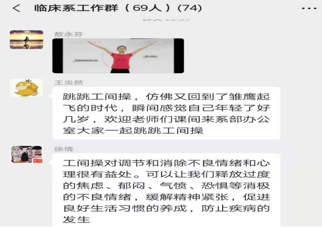 2020年11月10日-13日,结合教师工作实际,临床系采用“统一时间、相对集中、因地制宜、人人参与”的培训方式,组织系部教师线上线下开展“工间操”培训活动,并在系部工作群里交流学习心得。线上自学和线下培训井然有序的开展,临床系所有教师的积极参与,使培训取得良好成效。
