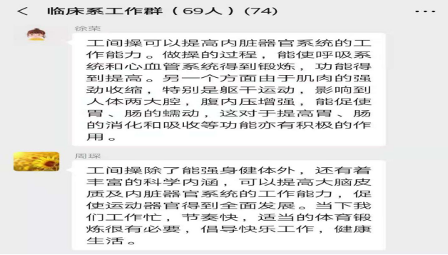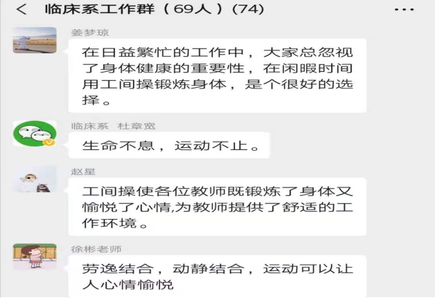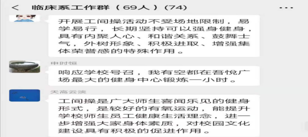 此次工间操培训活动,是临床系积极响应健康文明生活方式全参与的有力行动,也是推进爱国卫生行动的具体举措。工间操的开展不仅可以强健体魄,缓解工作压力,舒缓大家紧张的情绪,还可以锻炼我们肢体的协调性,增进同事间的感情。在下一步工作中,临床系会继续坚持认真开展“工间操”活动,积极促进全民健身与全民健康深度融合,进一步推动爱国卫生从环境卫生治理向全面社会健康管理转变。