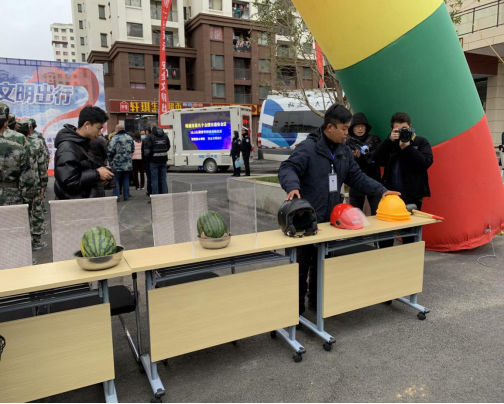 (现场工作人员讲解如何使用安全头盔等)