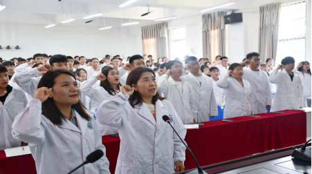 动员大会上,游玉凤老师为全体同学送上实习祝福,真挚而富有感情的祝福让同学们深受鼓舞。最后,两位老师带领全体师生集体重温了“医学生誓言”。“健康所系,性命相托”一句誓言,一生承诺,鞭策着同学们在今后的学习和工作中用自己的行动来恪守和践行医学生誓言,实现自己的人生价值。坚定整齐的宣誓声为本次实习动员大会画上了圆满的句号。