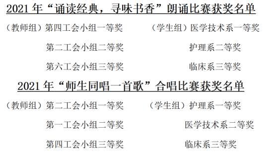 经过激烈角逐,根据评委们的专业评分,教师组和学生组分别评选出朗诵和合唱比赛一、二、三等奖,获奖名单如下: