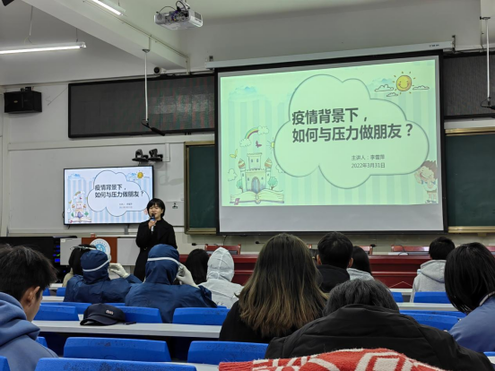 李雪萍老师结合BB贝博疫情防控实际,以“校园压力调适”为主题,引入有趣的心理学效应,结合体验活动的方式告诉同学们在疫情背景下,如何与压力做朋友。