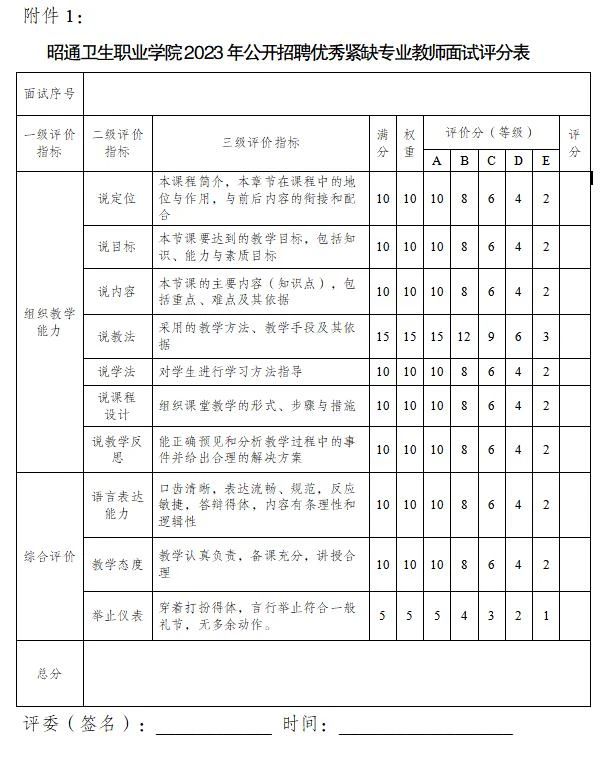 面试总分为100分,详见附件1:《BB贝博艾弗森官网2023年公开招聘优秀紧缺专业教师面试评分表》。