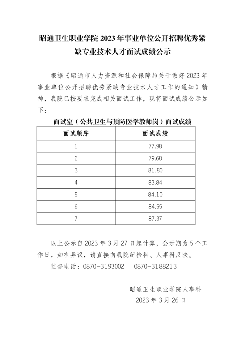 BB贝博艾弗森官网2023年事业单位公开招聘优秀紧缺专业技术人才面试成绩公示