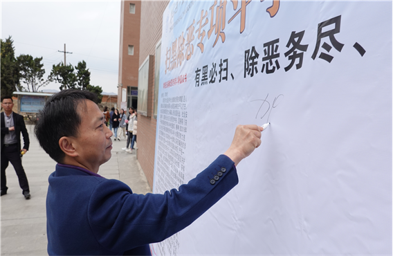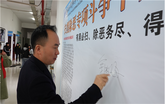 宣誓结束后,大家纷纷拿起手中的笔,在签名墙上郑重地签上自己的名字,承诺会坚决支持配合校园扫黑除恶专项斗争工作开展,全力净化校园环境。