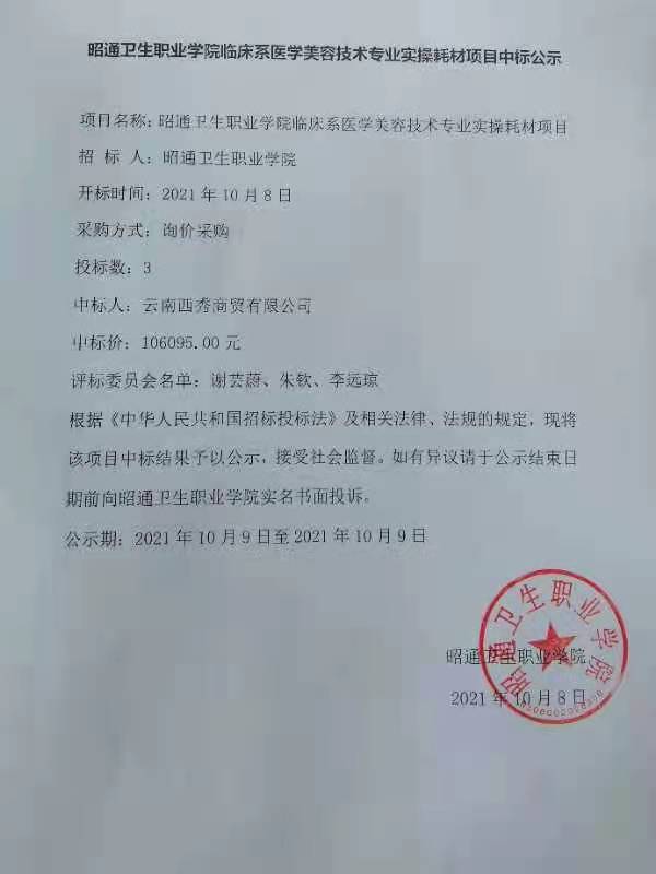 BB贝博艾弗森官网临床系医学美容技术专业实操耗材项目中标公示