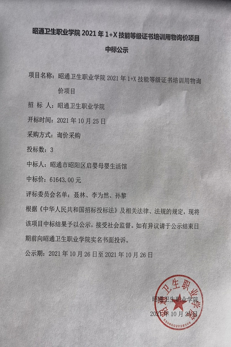 BB贝博艾弗森官网2021年1+X技能等级证书培训用物询价项目中标公示
